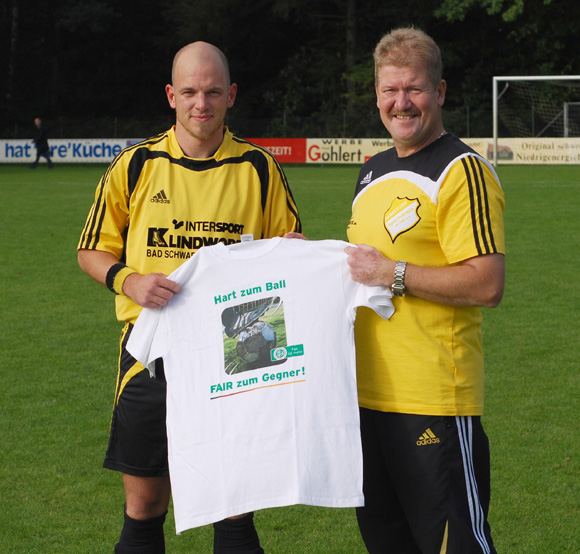Sportfreund, Im Namen des Vorstandes des Schleswig-Holsteinischen Fußballverbandes und des SHFV - Fair-Play-Beauftragten, Herrn Eberhard Münch, und dem Projektleiter "Schleswig-Holstein kickt fair", Herrn Tim Cassel, möchte ich mich recht herzlich für Ihr äußerst faires Verhalten bedanken. Sie haben durch Ihr vorbildliches Verhalten ein Beispiel dafür gegeben, dass es unter Fußballern nicht nur um Punkte und Tore, sondern auch um Spaß am Fußball, die Achtung und Ehrung des sportlichen Gegenparts und die Ehrlichkeit im Sport geht. Sie haben gezeigt, dass diese Werte im Fußball in unserer Zeit auch hier bei uns im SHFV etwas gelten. Machen Sie bitte auch in Zukunft weiter in Ihren Bemühungen um Sportlichkeit und Fairness gegenüber dem sportlichen Gegner, Schiedsrichter und den Zuschauern in unserem schönen Sport. Diese Werte sind es Wert, weitervermittelt zu werden. Für Ihre Bemühungen, die Aktion "Fair ist mehr" nachhaltig zu beleben, übersenden wir Ihnen als kleines Dankeschön ein T-Shirt des DFB nebst Aufkleber. In der Hoffnung, dass Sie sich der Aktion auch weiterhin verbunden fühlen, verbleiben wir." |