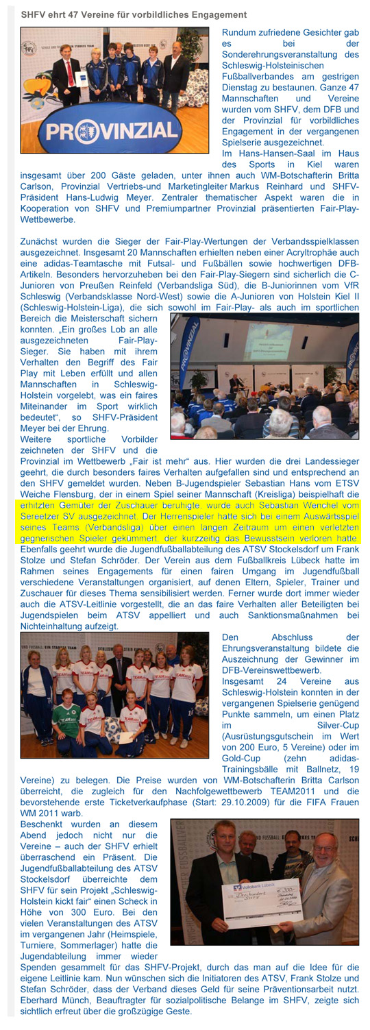 Am 15. September 2009 war Sebastian gemeinsam mit Peter Nowottny Gast im Haus des Sports in Kiel. Der Schleswig-Holsteinische Fußballverband hatte, gemeinsam mit seinem Partner, der Provinzial Versicherung, im Rahmen des Fair Play Wettbewerbes bzw. der DFB-Aktion "Fair ist mehr" die Sieger der jeweiligen Spielklasse zu einer zentralen Feierstunde eingeladen. Zur