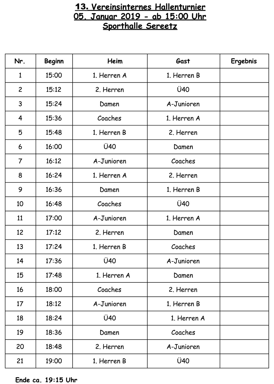 | Am Samstag, 05. Januar 2019 ab 15:00 Uhr ist es wieder soweit: Der Sereetzer Fußballhallenmeister wird ermittelt. Nun schon zum 12 Mal treten die 1. Herren A gegeneinander an, um den "Vereinsmeister" zu ermitteln. Der Spaß steht bei dieser Veranstaltung im Vordergrund. Zuschauer sind